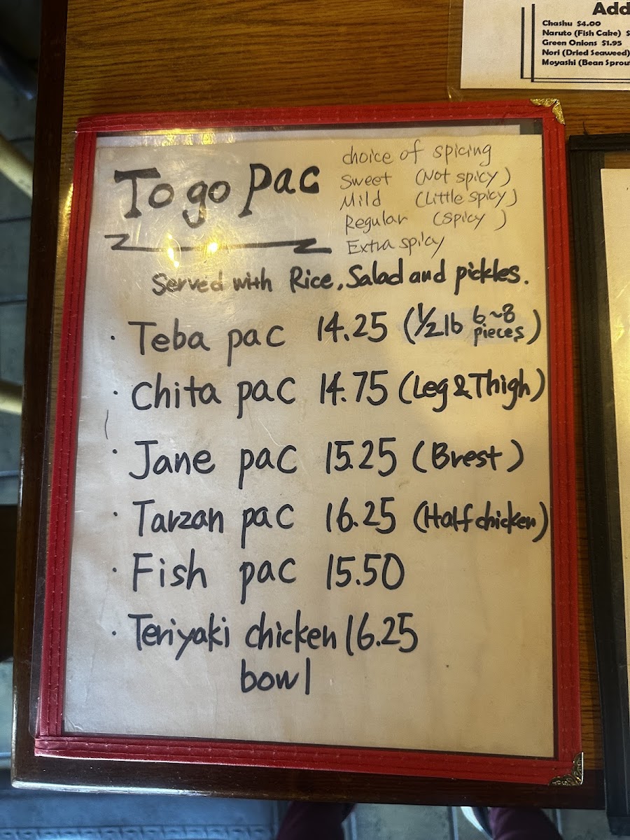 Specialty Chicken: This section features distinctive chicken dishes such as the Special Tebasaki wings and the Chita leg and thigh options, available in various portion sizes.