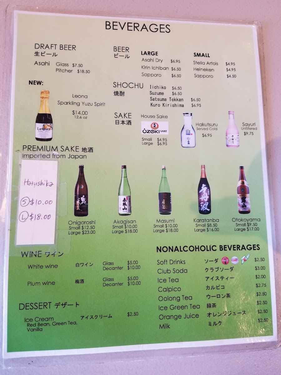 Beverages: The drink selection features non-alcoholic options like Calpico and Green Tea to complement the food offerings.